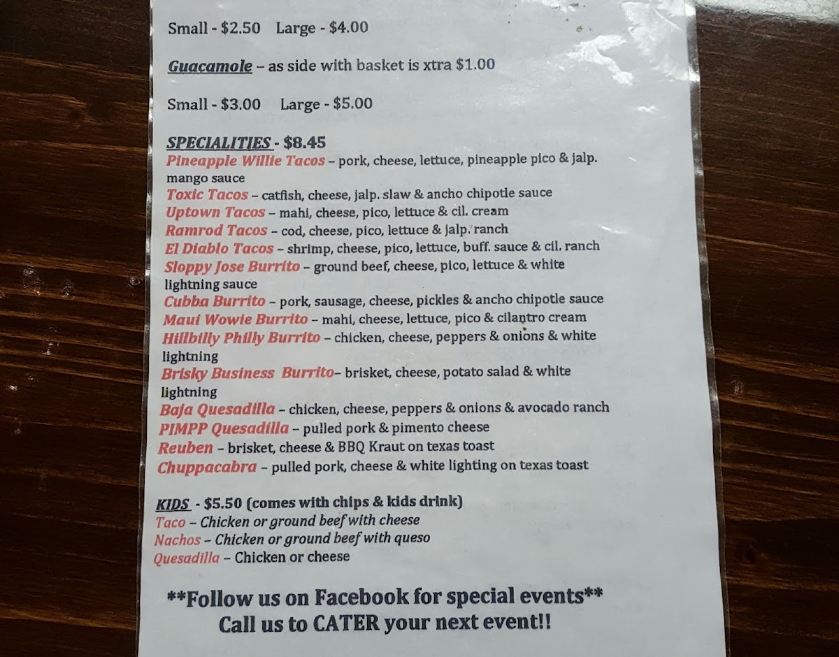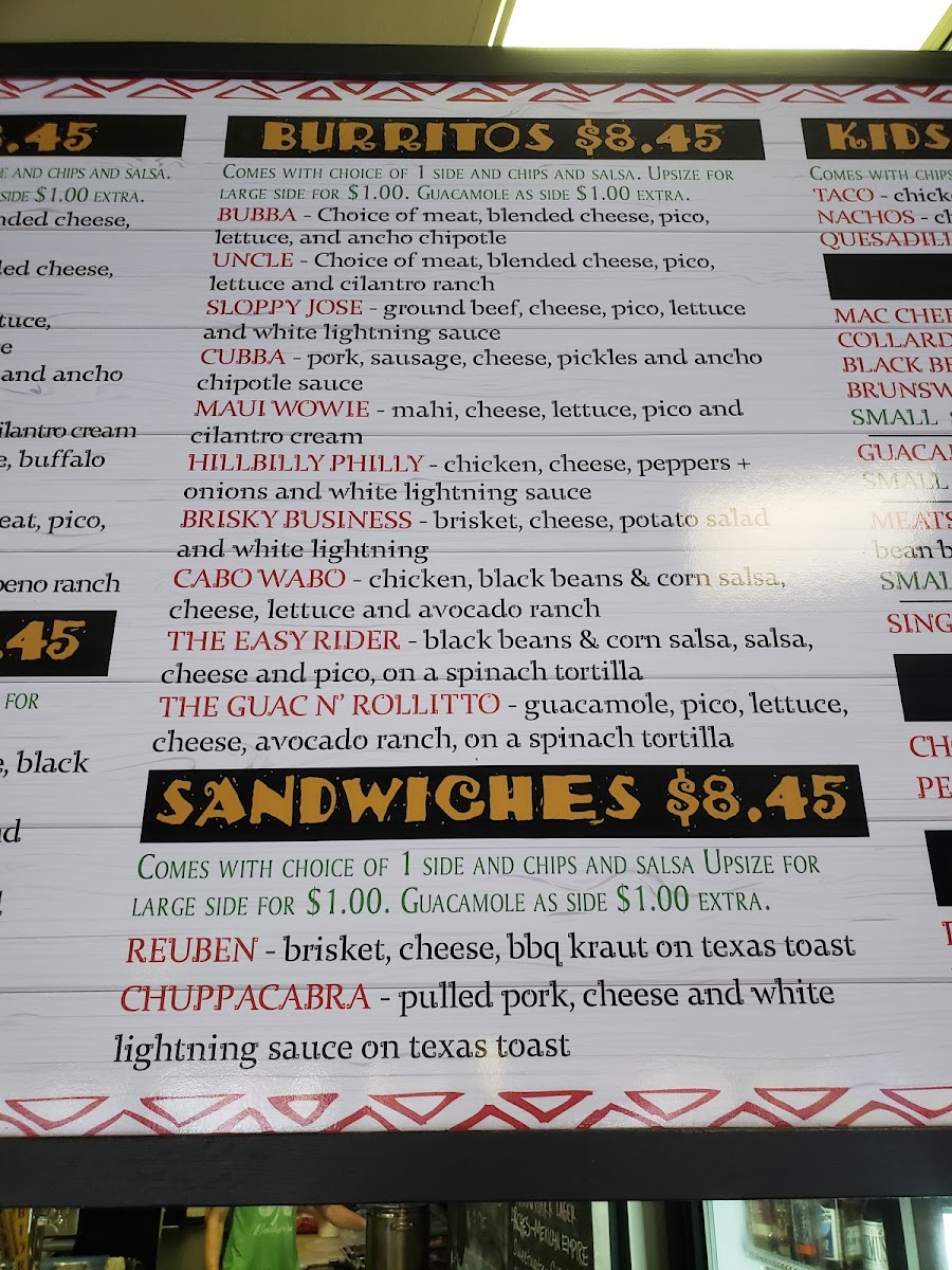 Brisket, cheese, potato salad & white lightening sauce.